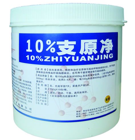 产品说明: 【通 用 名】10%延胡索酸泰妙菌素预混剂 【商 品 名】 10%支原净 【英 文 名】Tianmulin Fumarate Premix 10% 【汉语拼音】10%Yanhusuosuantaimiaojunsuyuhunji 【主要成份】10%包被延胡索酸泰妙菌素 【性 状】本品为白色或淡黄色粉末 【药理作用】1、药效学:延胡索酸泰妙菌素为半发酵、半合成的截短侧耳索(Pleuromutilin)类抗菌素, 通过干扰微生物核蛋白体,抑制微生物蛋白质的合成,从而达到抗菌作用。特别是对支原体、螺旋体和放线杆菌类病原体具有独特的抗菌作用。2.药动学:按推荐剂量口服延胡索酸泰妙菌素后,在肠道内迅速吸收,在2-4小时达到血药峰值。80%以上通过粪便排出,只有少量从尿中排泄。3.药物相互作用:延胡索酸泰妙菌素与大多数药物不发生结抗作用。但与聚醚类抗生素如莫能霉素、盐霉素等混合使用产生结抗作用。 【适 应 症】抗生素类药,预防和治疗支原体引起的呼吸疾病综合症,用于猪支原体肺炎和嗜血杆菌胸膜肺炎,也可用于猪密螺旋体引起的痢疾。 【用法用量】禽:每100g本品加水500kg,自由或集中饮用,(或100g本品拌料500kg)自由采食,连用3-5天。猪:每100g本品拌400kg),连用3-5天,预防量减半。 【停 药 期】畜、肉禽宰前7天;蛋禽开产前5天。